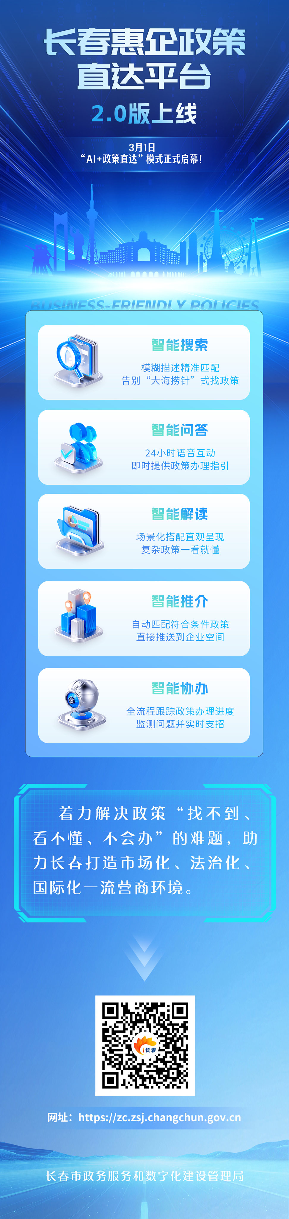 長春市政數(shù)局營商環(huán)境服務(wù)處二級調(diào)研員傅強介紹,2021年,長春惠企政策直達平臺1.0版上線。經(jīng)過五年實踐打磨完成全面升級,2.0版主打大數(shù)據(jù)+人工智能技術(shù),從企業(yè)視角打造AI應(yīng)用場景,讓企業(yè)輕松找政策、方便辦政策。