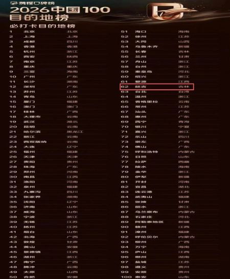 近日,攜程口碑榜正式發(fā)布“2026中國(guó)100目的地榜”,延吉憑借高漲的人氣與突出的綜合實(shí)力,成功入選,位列必打卡目的地第62名。這也是延吉連續(xù)三年榮登該榜單。