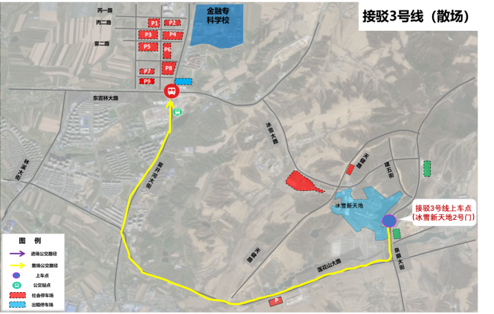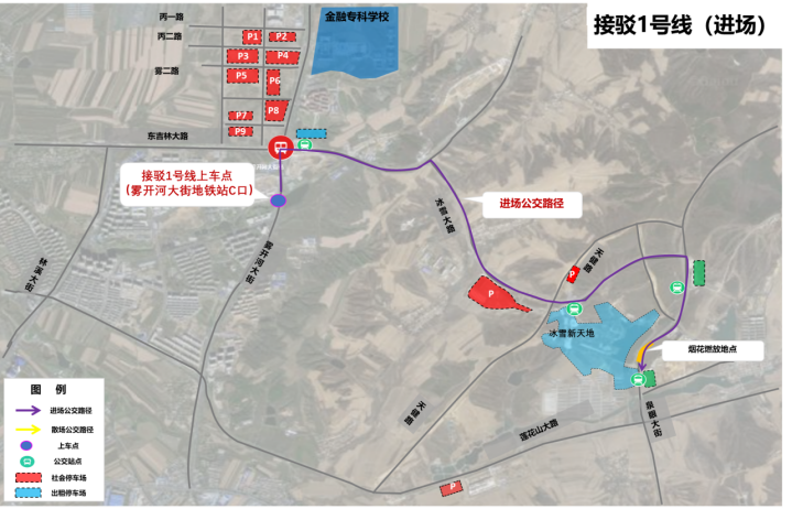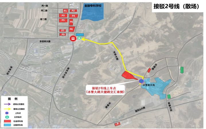 乘坐地鐵2號(hào)線(xiàn)在霧開(kāi)河大街站C口出站,換乘接駁1號(hào)線(xiàn)公交車(chē),前往冰雪新天地1、2號(hào)門(mén)。(如下圖)