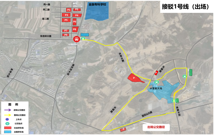 1號(hào)門(mén):游客在冰雪新天地1號(hào)門(mén)(天健路公交車(chē)臨時(shí)站點(diǎn))乘坐接駁2號(hào)線(xiàn)公交車(chē)返回地鐵霧開(kāi)河大街站B口,轉(zhuǎn)乘地鐵等交通方式離開(kāi)蓮花山。(如下圖)