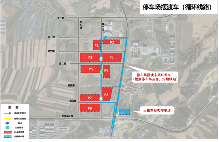 2號(hào)門(mén):乘坐接駁3號(hào)線(xiàn)公交車(chē),返回地鐵霧開(kāi)河大街站C口;換乘停車(chē)場(chǎng)擺渡車(chē),返回臨時(shí)停車(chē)場(chǎng)。(如下二圖)