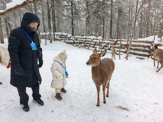行至景區(qū)中心處的“粉雪部落”,濃郁的東北風(fēng)情撲面而來。“智取威虎山”主題場景成了最熱鬧的打卡點,歡聲笑語不斷。鹿園里,孩子們輕輕撫摸馴鹿、喂食苔蘚,體驗著與森林精靈親近的樂趣!霸谀戏綇臎]見過真正的馴鹿,這種體驗太難得了”,來自云南的段先生一邊錄制視頻,一邊準(zhǔn)備向家人“炫耀”這份難得的美好。