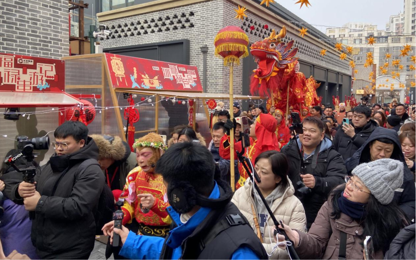 當(dāng)日舉行的巡游活動將氣氛推向高潮。由雪餅猴、舞龍舞獅、糖葫蘆NPC、二次元、瘋狂動物城等角色組成的多元方陣,沿著主街歡樂行進(jìn)。