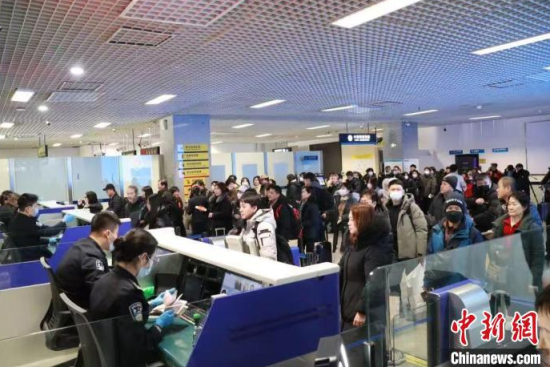 今年春節(jié)假期期間,入境旅客在延吉機(jī)場(chǎng)排隊(duì)等候查驗(yàn)。(資料圖)麻馨允 攝