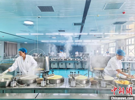 4月16日,在吉林省樺甸市的一家企業(yè)里,工人們正在制作煎餅!≈行律缬浾 蒼雁 攝