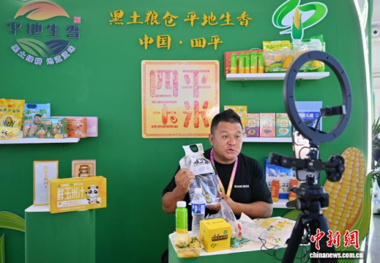 8月15日,吉林長春,商家在農(nóng)博園內(nèi)直播售買玉米。當(dāng)天,第二十四屆中國長春國際農(nóng)業(yè)·食品博覽(交易)會在長春開幕。本屆農(nóng)博會集中展示中國最前沿的農(nóng)業(yè)科技成果,彰顯“大國糧倉”的科技實(shí)力,吸引眾多參觀者近距離體驗(yàn)現(xiàn)代種植技術(shù)及優(yōu)質(zhì)農(nóng)產(chǎn)品。中新社記者 張瑤 攝