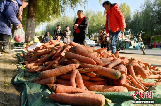 10月16日,吉林長(zhǎng)春,市民在挑選胡蘿卜。當(dāng)下正是中國(guó)東北民眾“囤秋菜”的季節(jié),滿(mǎn)載大蔥、白菜、胡蘿卜等秋菜的貨車(chē)停靠在長(zhǎng)春市區(qū)指定銷(xiāo)售區(qū)域,市民們穿梭挑選,忙碌地儲(chǔ)備過(guò)冬秋菜。中新社記者 張瑤 攝