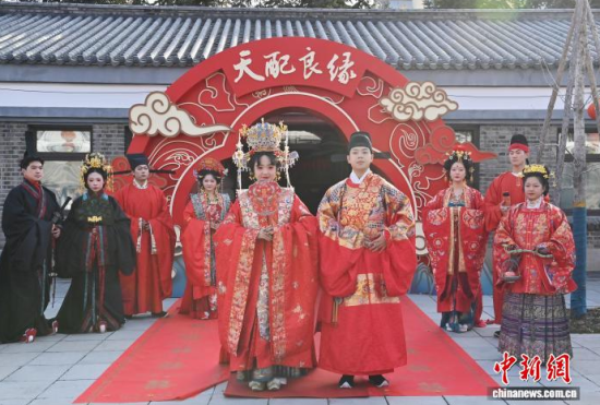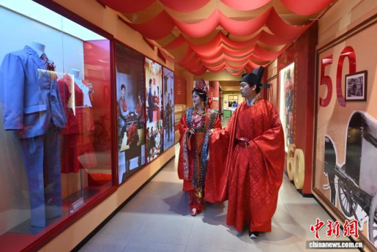 11月7日,偽滿皇宮博物院主辦的《天配良緣——近現(xiàn)代婚戀婚俗實(shí)物展》于長(zhǎng)春開幕。展覽通過婚書、嫁妝等300余件民間實(shí)物,帶領(lǐng)參觀者沉浸式感受不同年代的婚禮婚俗,F(xiàn)場(chǎng)通過漢服走秀、嗩吶演奏等演出,展現(xiàn)傳統(tǒng)婚儀魅力。中新社記者 張瑤 攝