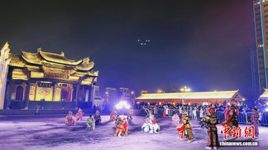 中新網吉林1月1日電 (記者 石洪宇)喜連成京劇藝術公園的戲臺上,千回百轉的青衣唱腔融合水袖、髯口元素,再現(xiàn)經典國粹形象。不遠處,沿松花江岸施放的煙花綻放夜空,與戲臺文藝遙相呼應。