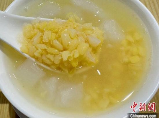 “世界糖水在中國,中國糖水在廣東!睂V州人而言,在炎熱的夏日或寒冷的冬夜,與好友相約糖水鋪,“食”上一碗滋補(bǔ)的糖水,甜蜜就能讓整個人“充滿電”。圖為馬蹄綠豆爽。 中新社記者 王堅(jiān) 攝