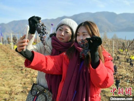 鴨綠江河谷冰葡萄進(jìn)入最佳采摘時期,游客在采摘冰葡萄。