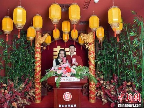 2月1日,在長春市朝陽區(qū)婚姻登記處,多對新人在辦理結(jié)婚登記。該婚姻登記處近日打造了三種不同風(fēng)格的拍攝場景,并為新人準備了鮮花、婚紗以及特色服裝等,給前來登記結(jié)婚的新人一個大大的驚喜。