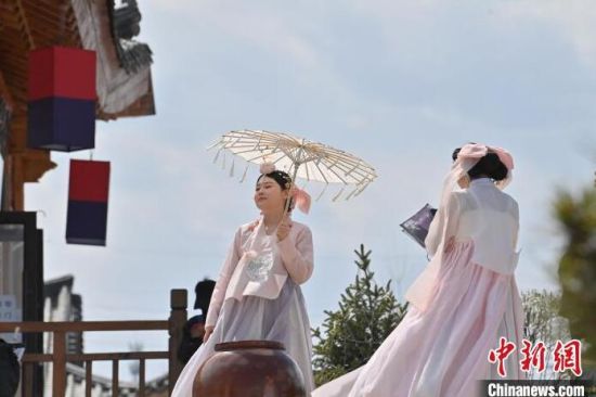 4月7日,在吉林省延邊州延吉市的中國(guó)朝鮮族民俗園內(nèi),游客身著朝鮮族服飾拍照。延邊是中國(guó)唯一的朝鮮族自治州和最大的朝鮮族聚居地,近年來(lái)延邊旅游持續(xù)火爆,朝鮮族服飾旅拍也成為最受歡迎的旅游項(xiàng)目之一。