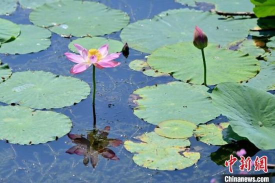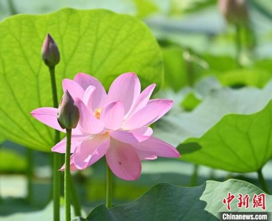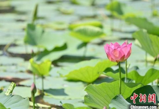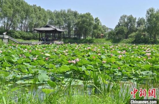 7月9日,在長春北湖國家濕地公園內(nèi),悄然綻放的荷花與翠綠的荷葉相互映襯,如詩如畫,吸引游客前來欣賞。(中新社記者 張瑤/攝)