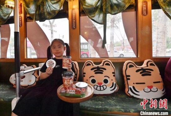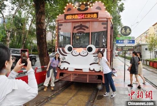 8月5日,吉林長春,游客在54路文旅東北虎專列內拍照。該專列是以“東北虎”為主題的有軌電車文旅專列,步入其中、綠意盈盈“森系”十足,吸引眾多游客前來打卡。(中新社記者 張瑤/攝)