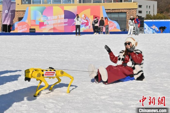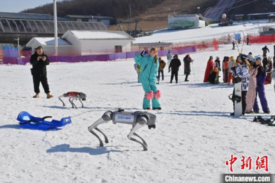 11月22日,在長春蓮花山滑雪場,機器狗在和小游客互動。當天,長春蓮花山滑雪場開板,新上崗的6只機器狗憑借著新式“狗”拉爬犁出盡風頭,惹得中外游客爭相合影。據(jù)悉,除了與游客互動,機器狗還能承擔物資運送、急救和安全巡邏等多種服務任務。中新社記者 張瑤 攝