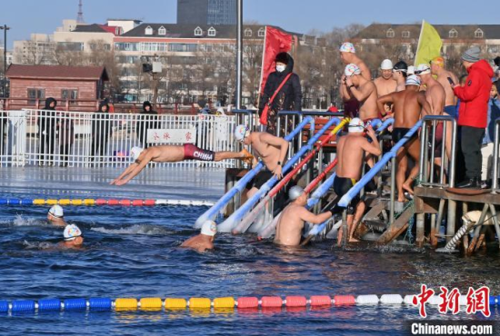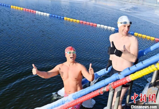2025年1月1日,在長(zhǎng)春南湖公園,冬泳愛好者破冰在湖水中暢游。當(dāng)天,中外百余名冬泳愛好者齊聚南湖,以冬泳的方式迎接新年。中新社記者 張瑤 攝