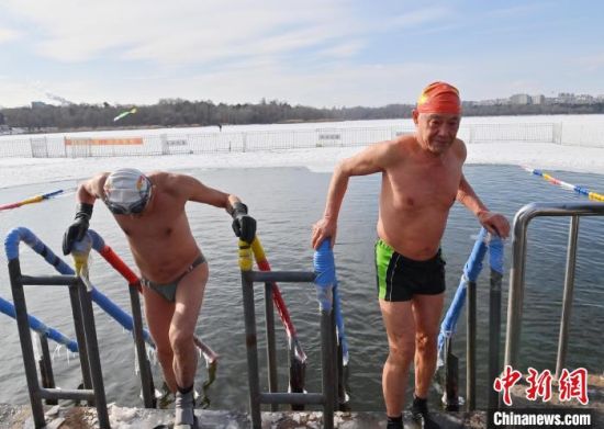 2月19日,在長(zhǎng)春南湖公園,吳長(zhǎng)海(右)準(zhǔn)備和泳友一起冬泳。今年85歲的吳長(zhǎng)海堅(jiān)持冬泳已有三十余年,冬泳已成為他每天生活中必不可少的一件事。當(dāng)天長(zhǎng)春氣溫達(dá)零下17攝氏度,吳長(zhǎng)海說(shuō),冬泳使他身體強(qiáng)壯,以后會(huì)堅(jiān)持下去。中新社記者 張瑤 攝