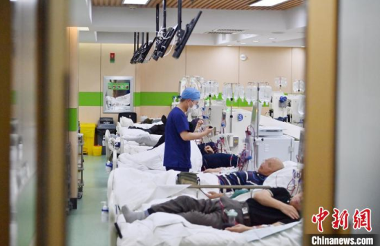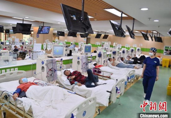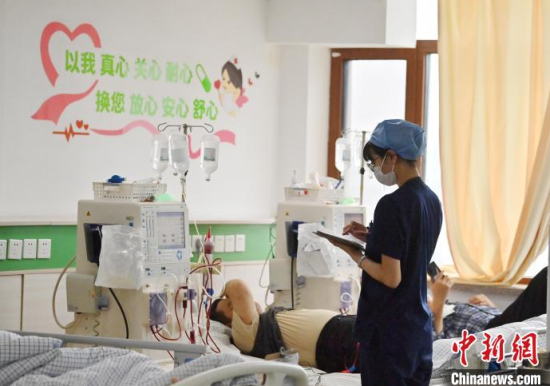 5月9日,長春中醫(yī)藥大學(xué)附屬醫(yī)院腎病科透析室內(nèi),護士在為患者進行透析治療。該科室日均接診近200名患者,每位患者的透析過程都需要數(shù)小時。治療期間,護士們會全程密切監(jiān)測患者生命體征,隨時準(zhǔn)備應(yīng)對突發(fā)狀況。多年來,醫(yī)護團隊以專業(yè)的技能和細致的關(guān)懷,持續(xù)為患者的生命健康保駕護航。中新社記者 張瑤 攝