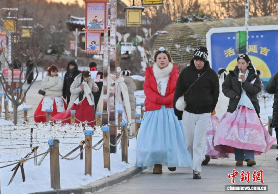 12月2日,在吉林省延邊州延吉市中國(guó)朝鮮族民俗園內(nèi),游客身著朝鮮族服飾拍照。作為中國(guó)唯一的朝鮮族自治州和最大朝鮮族聚居地,延邊近年旅游熱度持續(xù)攀升,朝鮮族服飾旅拍已成為當(dāng)?shù)刈钍軞g迎的旅游體驗(yàn)之一。盡管遭遇降溫降雪天氣,游客熱情依然不減,在銀裝素裹的園中定格獨(dú)具民族風(fēng)情的畫面。中新社記者 張瑤 攝