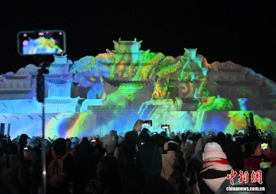 12月26日晚,吉林長白山,新落成的高30米、寬70米、用雪量10萬立方米的雪雕版“云頂天宮”正式點亮。這座以探險題材小說《盜墓筆記》為藍本雕琢的冰雪地標(biāo)廣受書迷關(guān)注。中新社記者 張瑤 攝