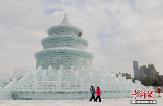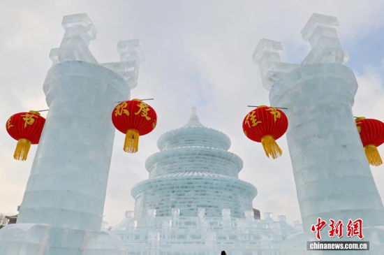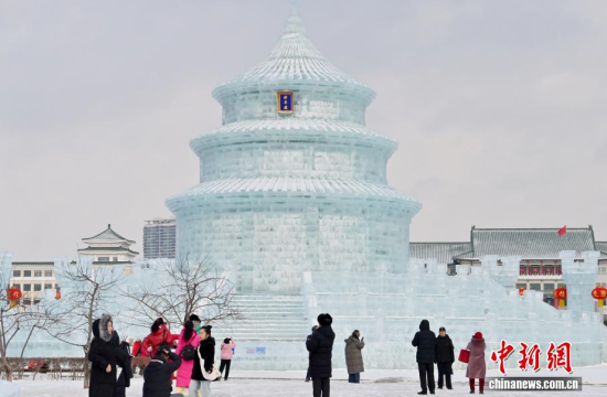 1月12日,在長春市的文化廣場(chǎng)上,一座以北京天壇祈年殿為原型的巨型冰雕成為冬日一景。冰雕高約21米,用冰量5010立方米,飛檐、殿頂?shù)葌鹘y(tǒng)建筑細(xì)節(jié)均被精準(zhǔn)復(fù)刻,陽光下晶瑩剔透,配合紅燈籠冰柱點(diǎn)綴,盡顯中式浪漫韻味,吸引眾多游客前來拍照打卡。中新社記者 張瑤 攝