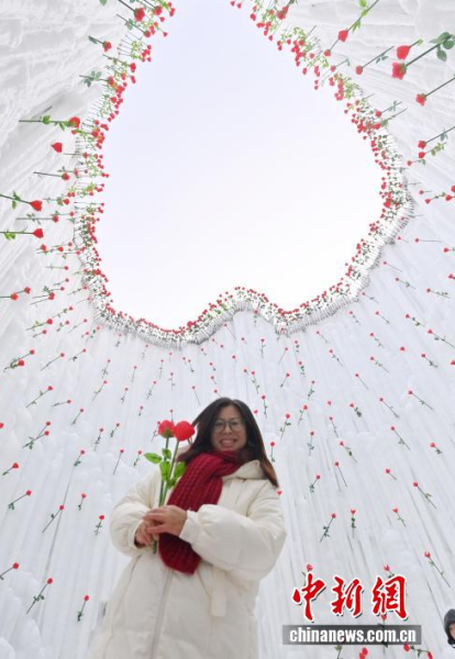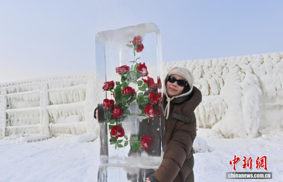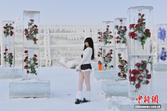 1月13日,在長春云瑯冰雪公園內(nèi),一組別具匠心的玫瑰冰雪景觀吸引了眾多游客。中新社記者 張瑤 攝