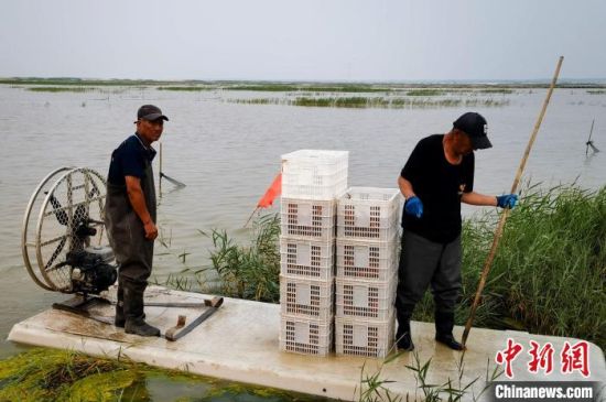 養(yǎng)殖戶(hù)捕撈河蟹。(資料圖) 潘晟昱 攝