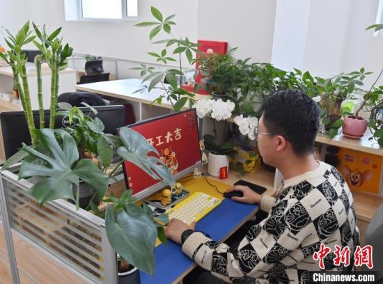 2月14日,吉林長春,一名員工將工位改造成“森系工位”!埇 攝