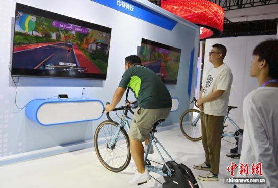 2023年8月24日,吉林長春,市民體驗比特騎行,感受數(shù)智競技運動的樂趣。第十四屆中國—東北亞博覽會首次設(shè)置現(xiàn)代裝備與新能源合作主題館,集中展示人工智能平臺、新能源智能轎跑、制氫整流電源等裝備和產(chǎn)品。